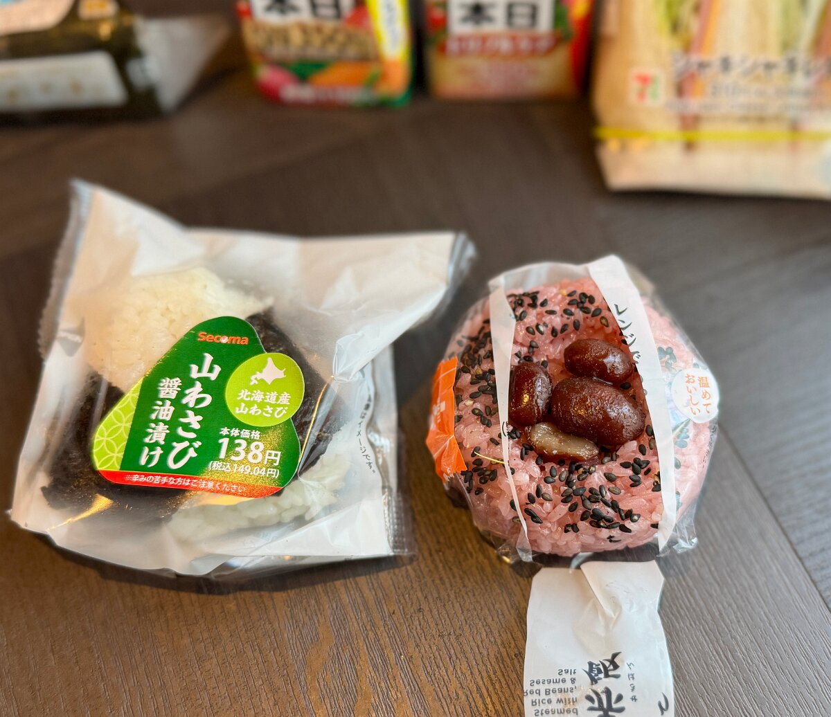 朝食はおにぎり 北海道らしく金時豆の赤飯です