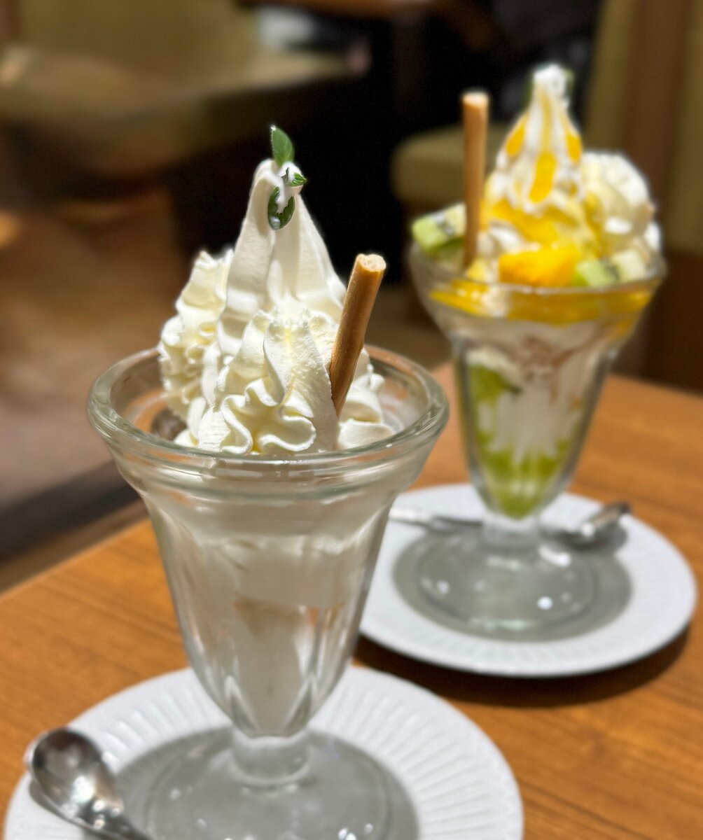 よつ葉ホワイトコージで白いパフェとキウイとマンゴーのヨーグルトパフェ